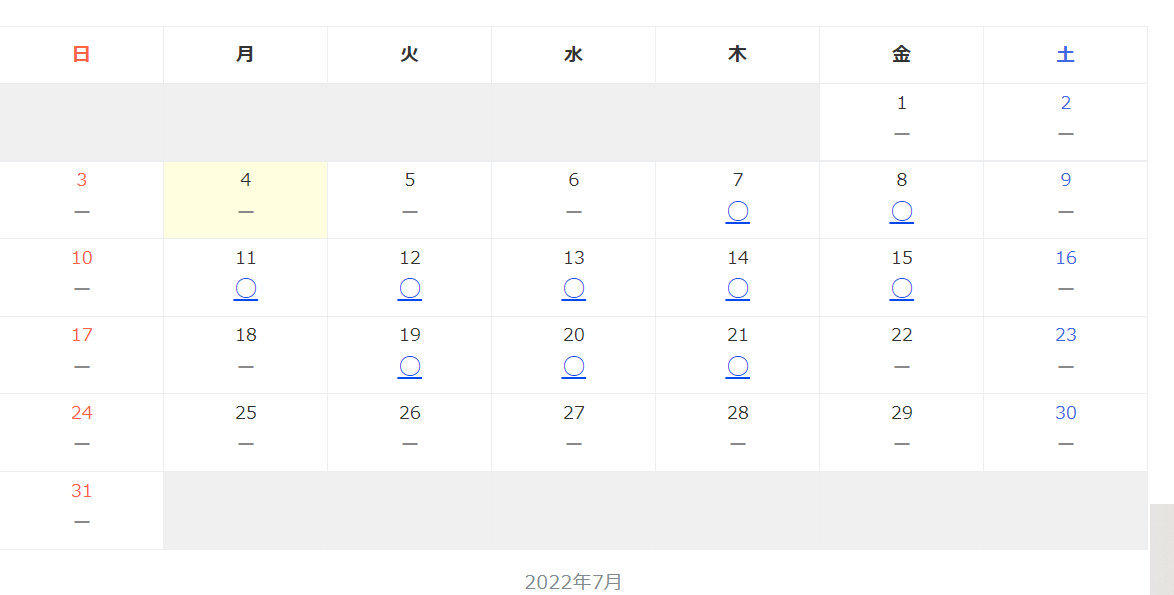 面談予約のページを開くと、以下のような画面が現れます。〇のついているところから、ご都合のよい日時をお選びください。
