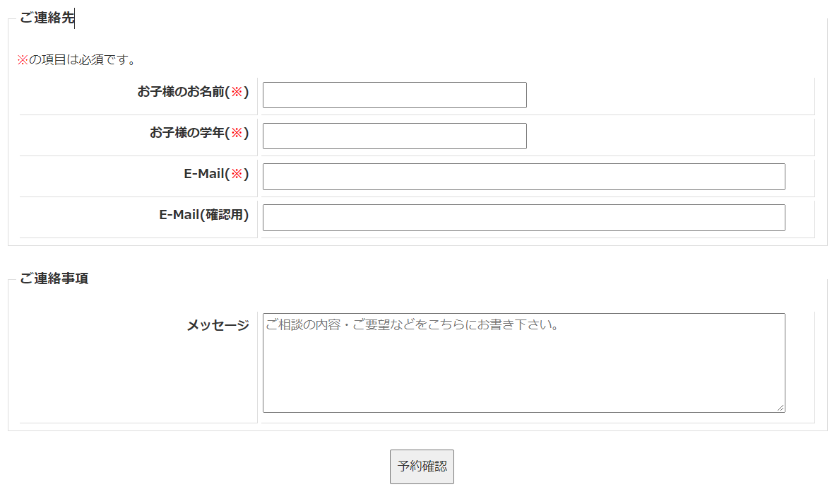 お時間を選択いただきますと、下記のような画面が現れます。メッセージ欄にはご相談内容、志望校に関すること等ご記入の上、お申込み下さい。