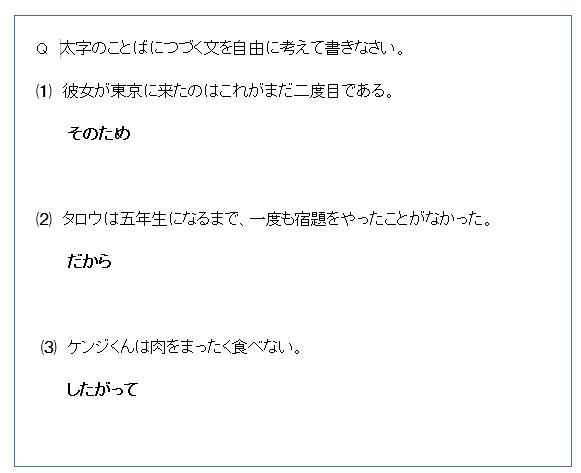 お子様たちはそれぞれ工夫しながら文を書いてくれました。間違った使い方をしてしまったときは修正し、その後に何度も使用してもらい、正しい用法を自然と身につけられるようにしております。「したがって」の意味がわからず、質問をしたお子様が数名いらしゃいましたが、意味を説明した後には、正しい文が書けていました。繰り返しが重要ですので、日々少しずつ練習をしてもらいます。
