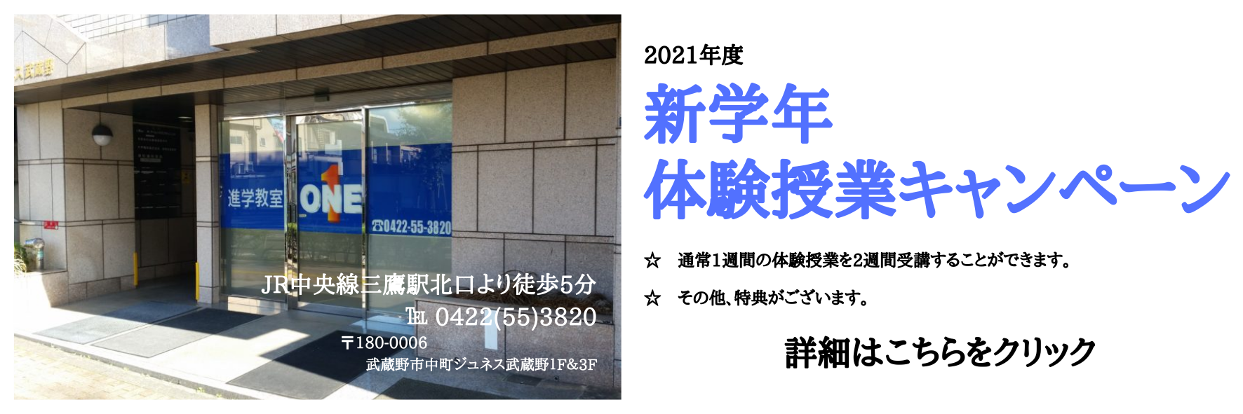 現在、ONEでは「新学年 体験授業キャンペーン」を実施しております。新学年授業が始まる2月~3月の時期に、緊急事態宣言下であったことなどから、塾探しや体験授業に時間をかけられなかったという方もいらっしゃるかと思います。そこで、ONEでは、授業の雰囲気などをじっくりとみていただければということで、体験授業の期間を通常よりも長く設定させていただきました。