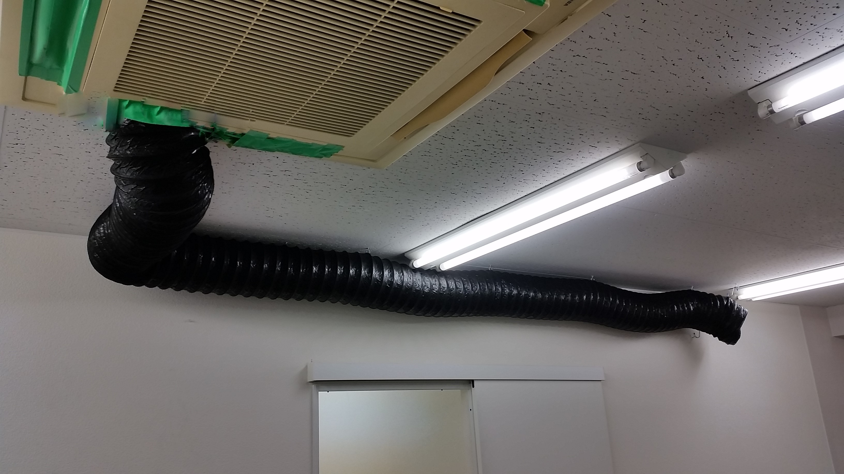 ※ 暑さ対策として、エアコンの吹き出し口にダクトホースをつなぎ、サーキュレーターも併用して教室全体に冷風が行き渡るようにしております。また、西側の大きな窓にはサンシェードをつけ、午後の日差しに備えるなど、様々な暑さ対策を施しています。