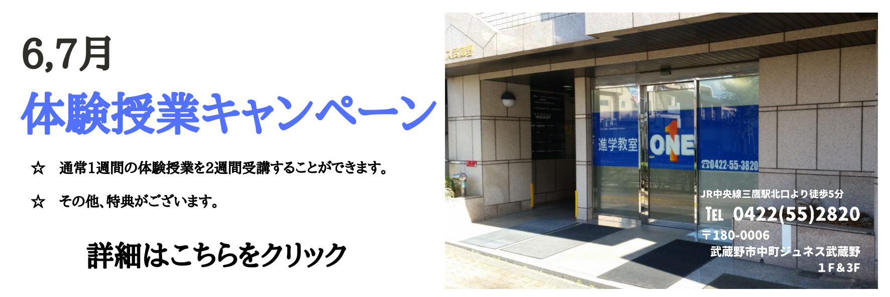 6月~7月は体験授業キャンペーンを実施しております。詳細はキャンペーンのページをご参照下さい。