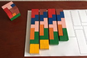 上の写真を見てもらうと小さい図形でのパズルの組み方が、大きい図形でのパズルの組み方のヒントになることが分かると思います。それ以外にも角に置くべき部品はどれか、目的の図形を作るためには何個の立方体が必要かなど、手掛かりになる事項がいくつかあります。まず自分ができることをやってみる、そして自分で問題解決の糸口に気づくということを目標に、パズルに取り組んでもらいました。