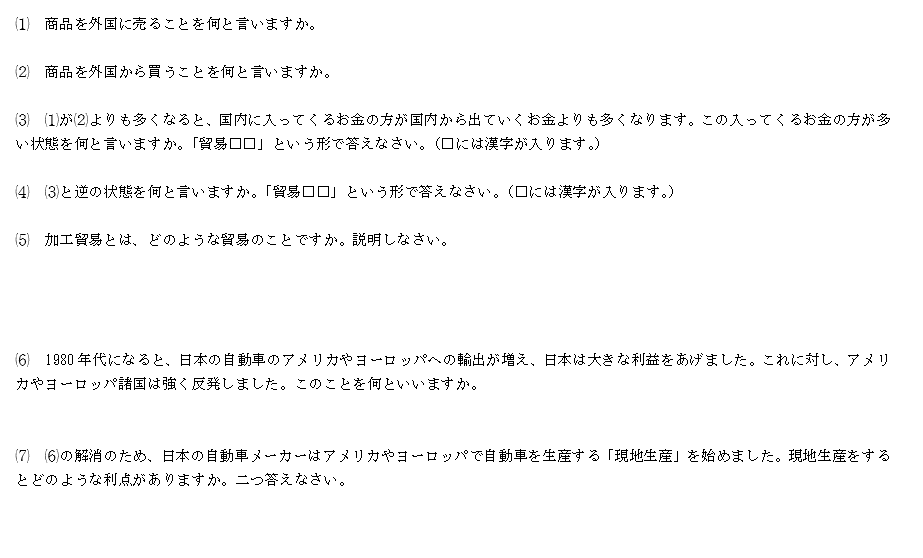 授業では、「貿易」について扱いました。次回はこの内容に関するテストを実施します。テストの問題については、あらかじめ予告をしています。下はその一部です。
