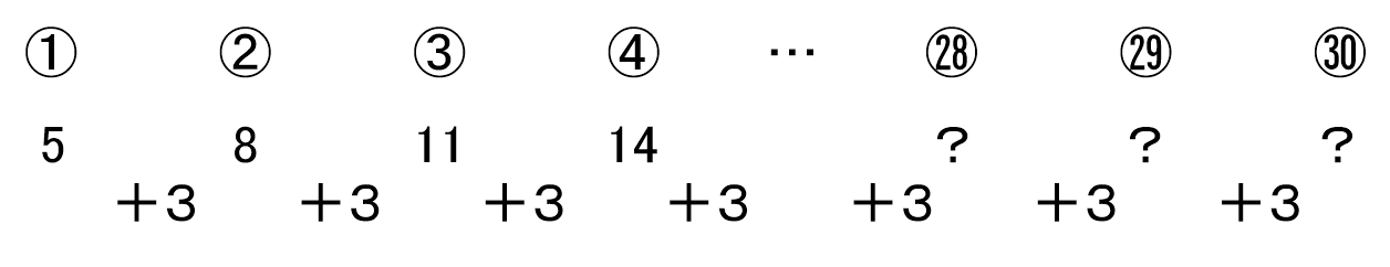 1番目から30番目までに数が30個あることから、数と数の間にある「+3」が29個あることを読み取って、30番目の数を求めることになります。数という「もの」の個数と数と数の「間」の個数を意識する練習です。「もの」の個数と「間」の個数を毎回具体的に書いて考える演習を、繰り返すことで、等差数列の考え方を理解してもらいました。