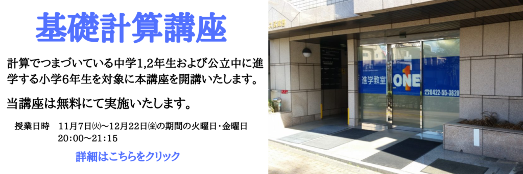 数学「基礎計算講座(無料)」のお申込みについて 6年生 X Facebook はてブ LINE Pinterest コピー 2023.10.31 「基礎計算講座」についてのお申込み受付を開始しています。お問い合わせいただき、ありがとうございます。 講座を受講する前に、お子様の弱点を発見するための診断テストを受験してもらいます。11月1日(水)・2日(木)・4日(土)・6日(月)に受験が可能ですので、小学校範囲の計算(小数や分数)に不安のある方は、ご検討いただければと存じます。お申込み・お問い合わせはお電話(0422-55-3820)またはお問い合わせフォームよりお願いいたします。 お問い合わせフォームはこちら。