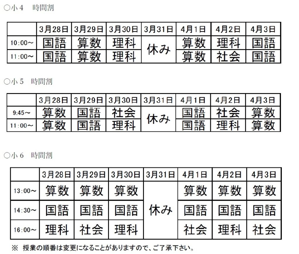 28日(金)より春期講習が始まります。以下、時間割となりますので、ご確認下さい。