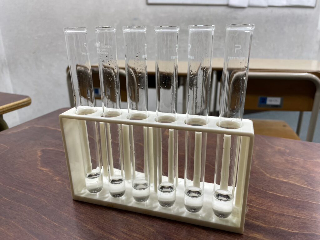 最終的に、全員が水溶液を同定することに成功しました。今後、受験を考えると純粋に知識を入れることも必要になってきます。しかし、可能な限り体験を伴い実感をすることは、今後の思考と知識の定着のために大切になります。実験を行い自分の知識を実践的に使用することで、思い出すきっかけを提供することができればと思います。