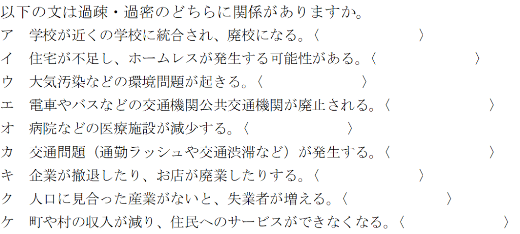 「過疎」・「過密」については、言葉の意味だけを覚えてきてもらい、テストにおいては以下の問題を解いてもらいました。