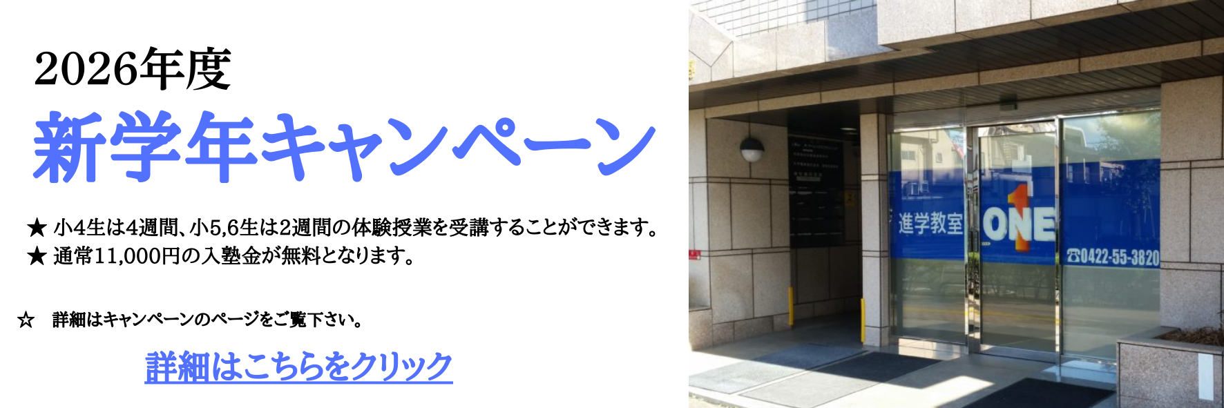 2月9日(月)より、新学年の授業がスタートします。※ 新学年授業の詳細はこちら → 新学年授業のご案内進学教室ONEでは、この機会に「新学年キャンペーン」を実施いたします。・新4年生の方は、通常1週間の体験授業を4週間受講することができます...