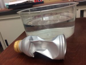 空きカンの中に少量の水を入れ、フタをしない状態で熱します。しばらくすると水が蒸発し体積が大きくなって、入りきらない水蒸気がカンの外に出ていきます。水が蒸発しきった段階でフタをしめ、冷やします。それにより、カンの中の水蒸気が水に戻り、大きくなった体積が小さくなります。また、体積が小さくなることで、カンの中の水蒸気の部分が真空状態になり、その結果カンが潰れます。
